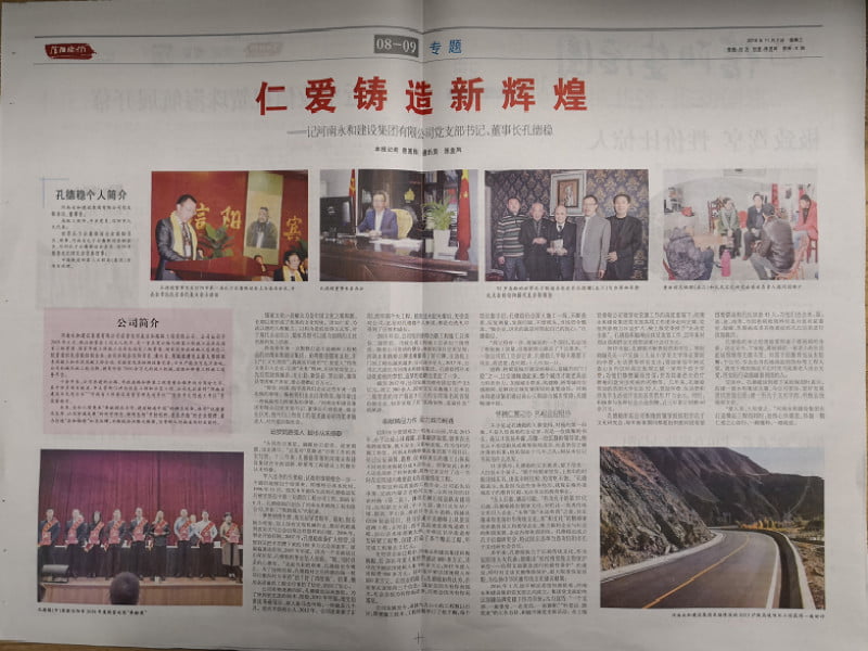 2018年11月7日,《信陽晚報》刊發(fā)了對河南永和建設(shè)集團有限公司黨支部書記、董事長孔德穩(wěn)的相關(guān)專訪內(nèi)容,文章對于孔德穩(wěn)的創(chuàng)業(yè)之路、經(jīng)營之道、踐行企業(yè)社會責(zé)任之舉以及弘揚傳統(tǒng)文化之策進行了深刻剖析。