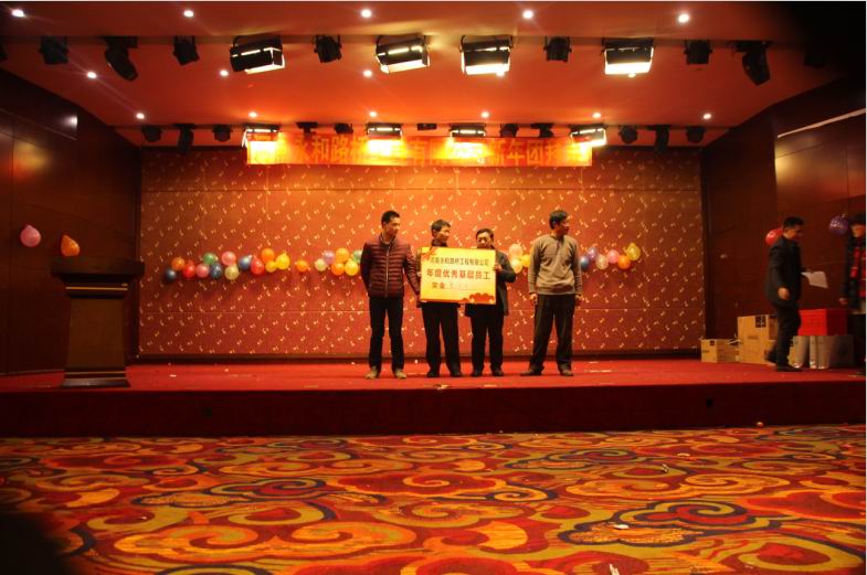 2016年2月4日晚,農(nóng)歷臘月26日晚,河南永和路橋工程有限公司在信陽市五星 級酒店中樂百花酒店隆重的舉行了2016年新春團拜會,本次團拜會由公司全體員工及家屬、公司的合作伙伴、朋友等共同出席,大家歡聚一堂、把酒言歡、其樂融融。公司董事長孔總發(fā)表新年賀詞比代表公司對年度優(yōu) 秀個人及團隊進行了表彰。公司還為到場的每位小寶寶送上新年祝福和紅包,并準備了抽獎環(huán)節(jié)。大家歡歌笑語,一直將熱鬧、愉快的氛圍維持到午夜。圖為團拜會期間頒獎儀式