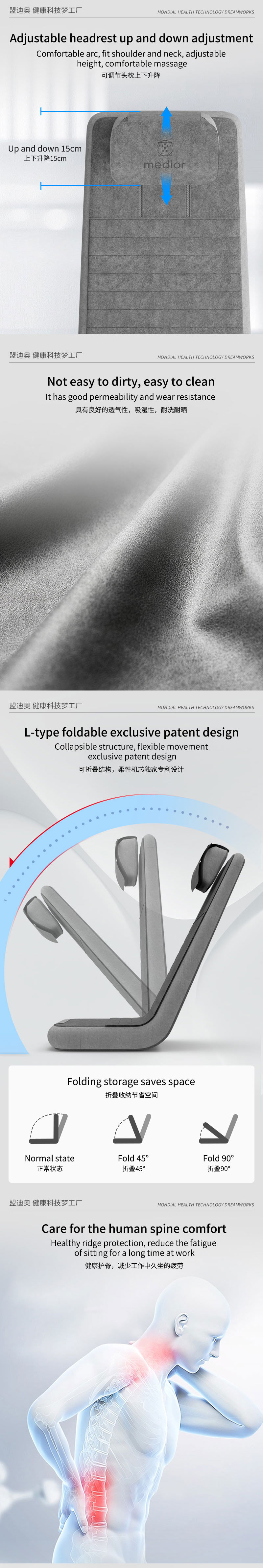 1、L型機(jī)芯結(jié)構(gòu),對折包裝縮小體積2、獨(dú)家專利柔性機(jī)芯3、力度三檔調(diào)節(jié),定點(diǎn)按摩,腰背按摩、臀腿按摩、全背按摩模式選擇4、背部行走揉捏,按摩區(qū)域加長到從肩膀到大腿;5、更加貼合不同款式的椅子整體可對折收納