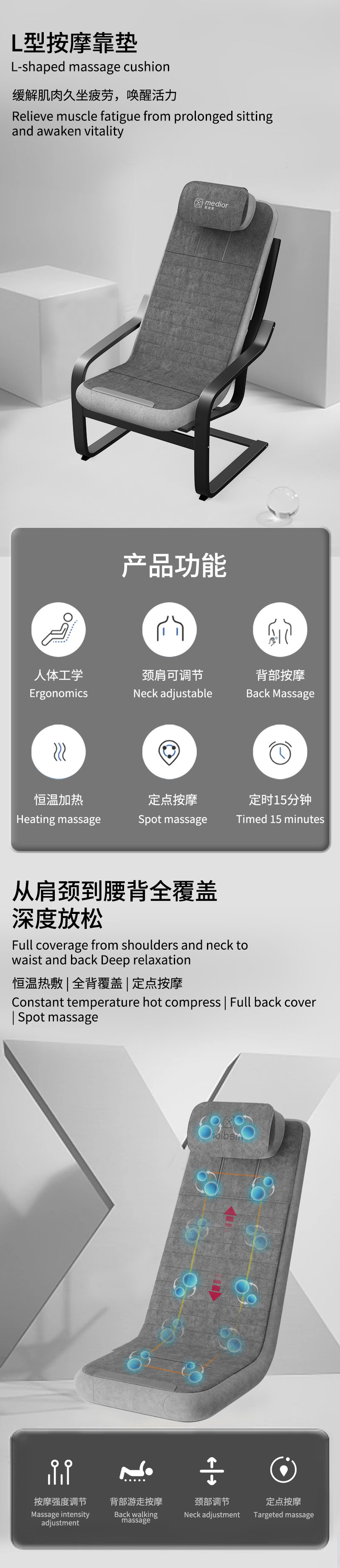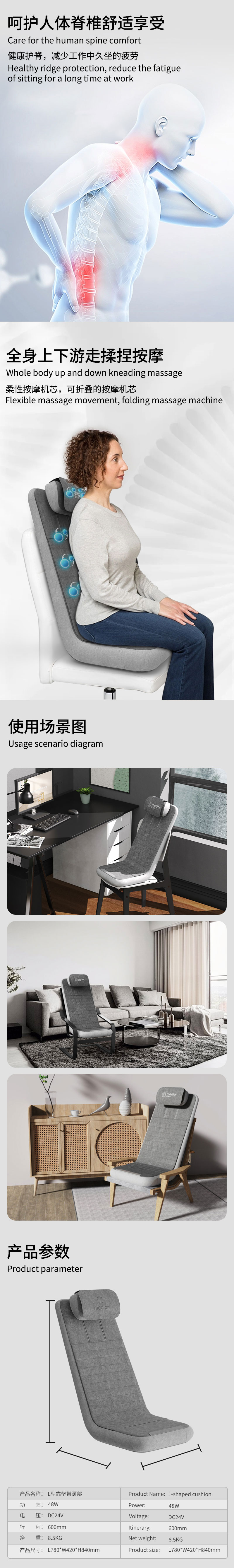 1、L型機芯結(jié)構(gòu),對折包裝縮小體積2、獨家專利柔性機芯3、力度三檔調(diào)節(jié),頸部揉捏,定點按摩,腰背按摩、臀腿按摩、全背按摩模式選擇4、頸部背部行走揉捏,按摩區(qū)域加長到從肩膀到大腿;5、更加貼合不同款式的椅子整體可對折收納6、亞馬遜標準包裝尺寸